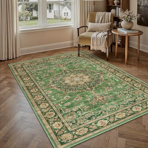 PureCozy Green Rugs for Bedroom Living Room 120x170cm, Vintage Soft Area Gold Rugs with Non-Slip Backing, Machine Washable, Traditional Oriental Printed Low-Pile for Kitchen Dining Room Laundry Office