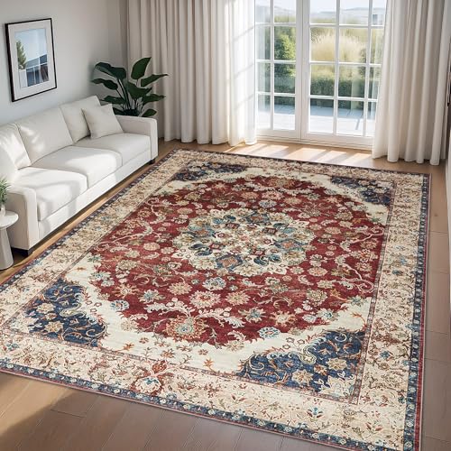 Aspire Homeware Washable Gold Red Rugs Living Room Large 160x230 cm Short Pile Area Rugs for Bedroom Dining Room, Soft Non Slip Carpet for Kids Room Traditional Vintage Design Boho Rug, Whisper