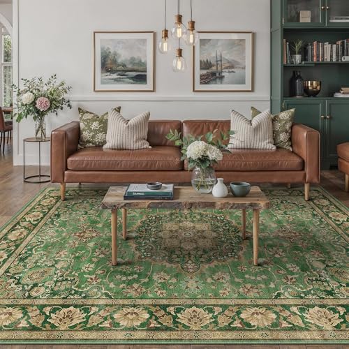 PureCozy 160x230cm Washable Green Rugs for Bedroom Living Room, Vintage Soft Area Gold Rugs with Non-Slip Backing, Lightweight Low Pile Printed Cosy Carpet for Kitchen Office Dining Room Playroom