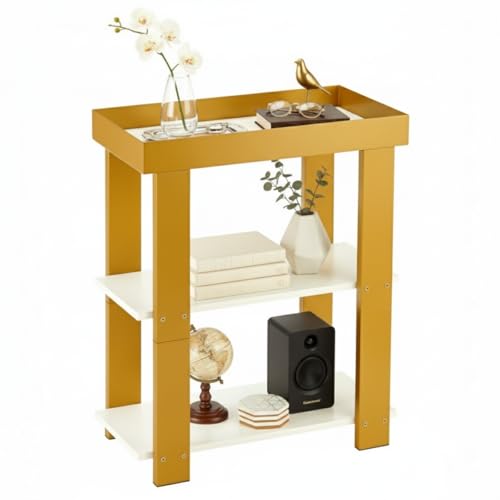 Modern 3-Tier Gold Side Table, Narrow End Table with White Tray Top Shelves, Slim Nightstand Bedside Table for Small Spaces, Living Room, Bedroom, Bathroom Storage Organizer Stand (White+Gold)