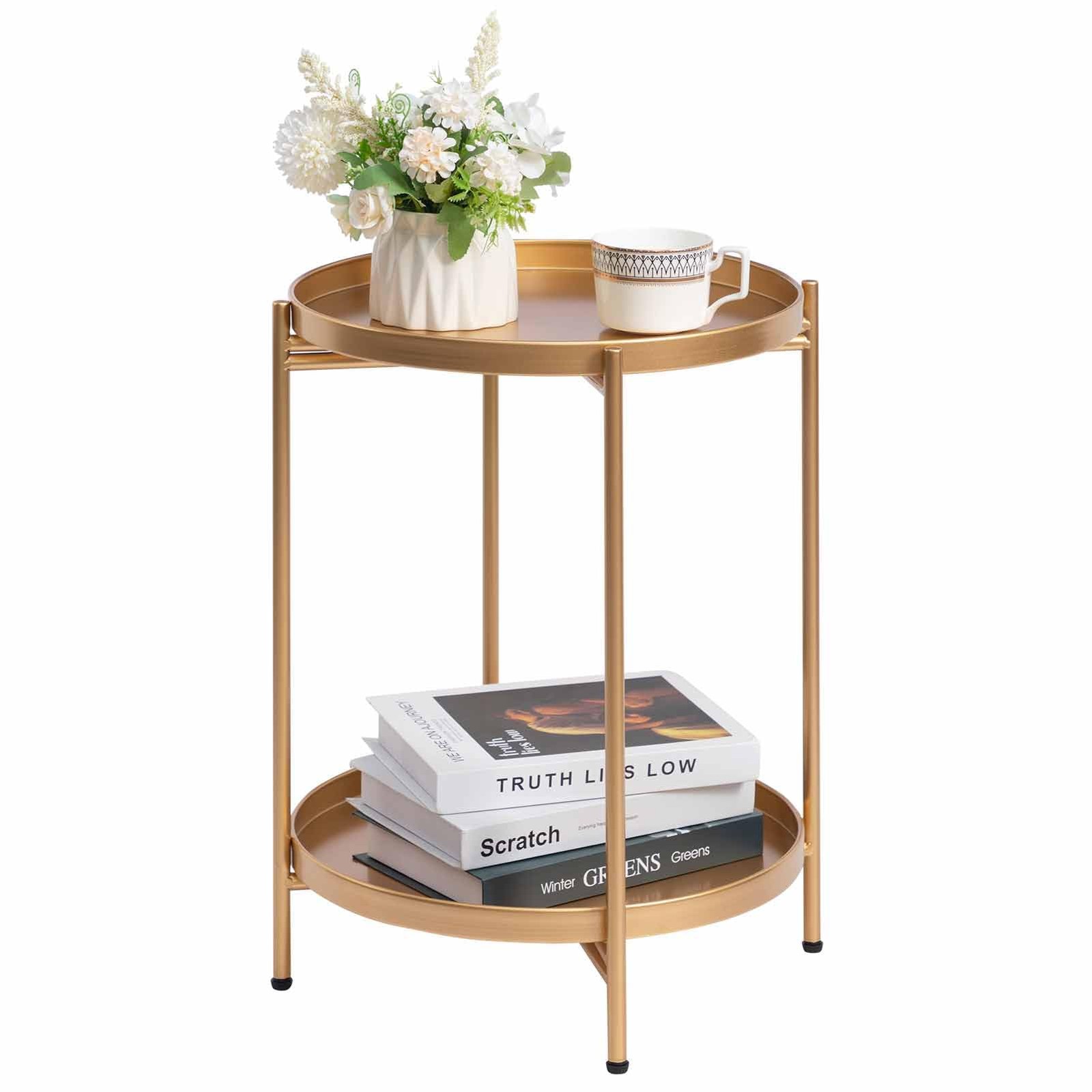 HollyHOME Gold Round Side Table Living Room Small Metal Coffee Table for Balcony Patio 2 Tier Tray End Table Nightstand for Bedroom