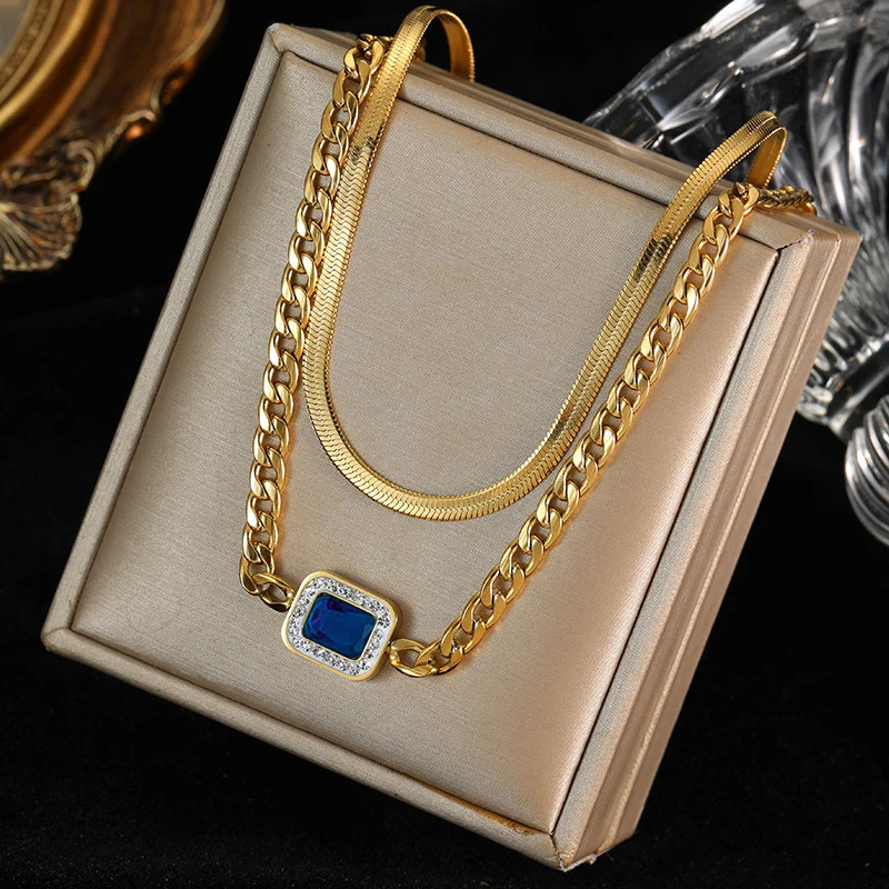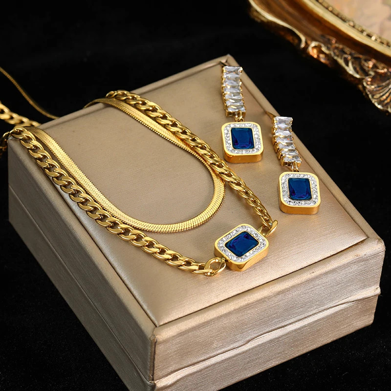 316L Stainless Steel Blue Zircon Gold Color Snake Chain Necklace Earrings