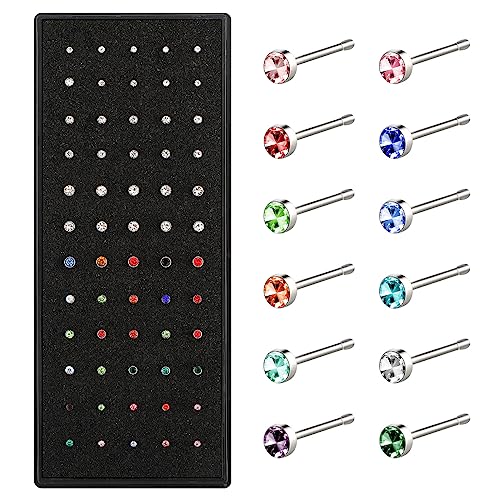 Yolev 60pcs Surgical Stainless Steel Nose Studs, Body Piercing Jewelry for Women Men Bone Silver Rose Gold Black Rainbow Pack Steel Faux Nose Piercing Cuffs