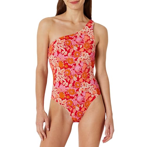 Amazon Essentials Women's One-Shoulder One-Piece Swimming Costume, Bright Poppy Red Folk Floral, 18