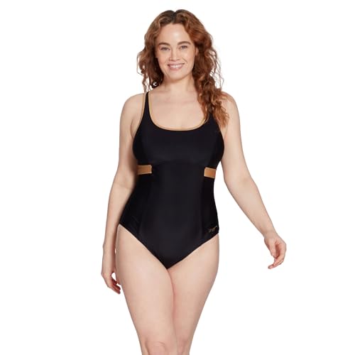 Zoggs Women's Dakota Crossback Eco Fabric One Piece Swimsuit, Swimming Costume Black/Gold