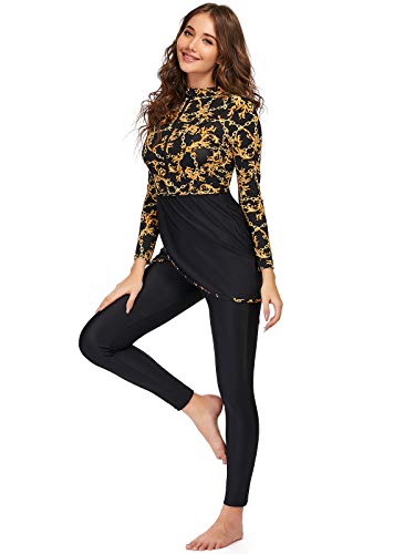 Burkini Swimwear for Ladies UK, Modest Swimwear for Women, Muslim Islamic Swimming Costume Full Body Swimsuit Long Sleeve Top Skirt and Pants Two Pieces Full Cover Bathing Suit Black Gold&Flower S