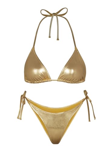Metallic Bikini Sets For Women - Silver Micro Bikini Sexy Swimwear Halter Neck Triangle Top High Waisted Tie Side Thong Bottom Shiny Swimsuit(Gold,XS,1026r)