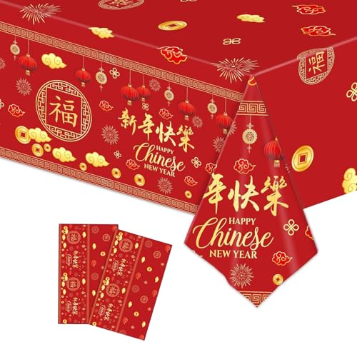 2pcs Chinese New Year Party Tablecloth Red and Gold Table Cover, 137 * 274cm Plastic Spring Festival Tablecloths,Happy Chinese New Year Party Dinner Tablecover for 2025 Spring Festival Party Decor