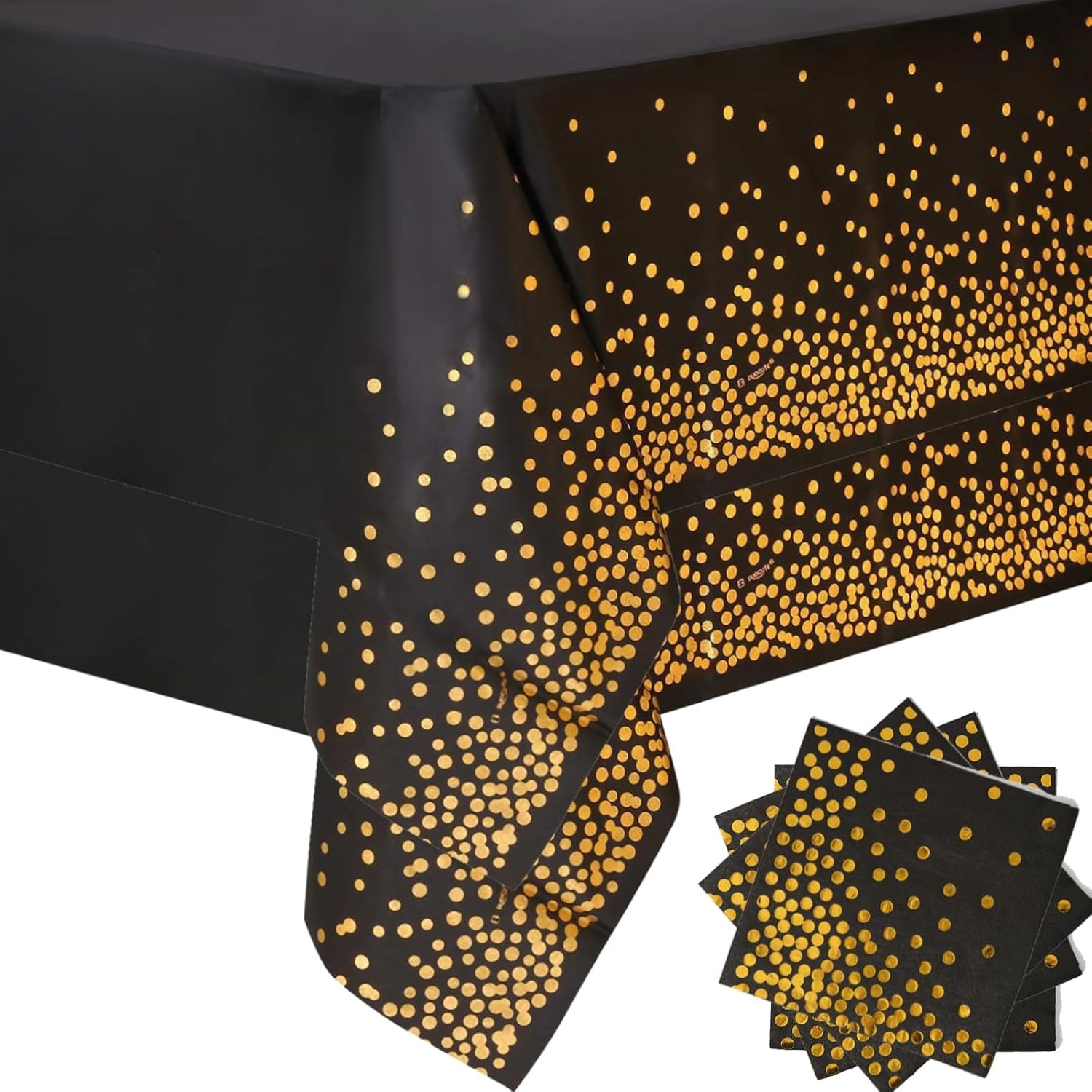 12-Pack Black & Gold Dot Disposable Tablecloths + Gold Satin Runner â Wedding, Birthday, Baby Shower, Anniversary, Christmas, NYE