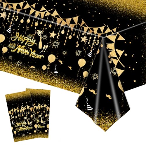 Happy New Year Eve Table Cloth Party 2pcs Plastic Tablecloths,137 * 274cm Black Gold Large New Year TableCloth Happy New Year Eve Party Dinner Tablecover for 2025 New Year Eve Party Table Decorations