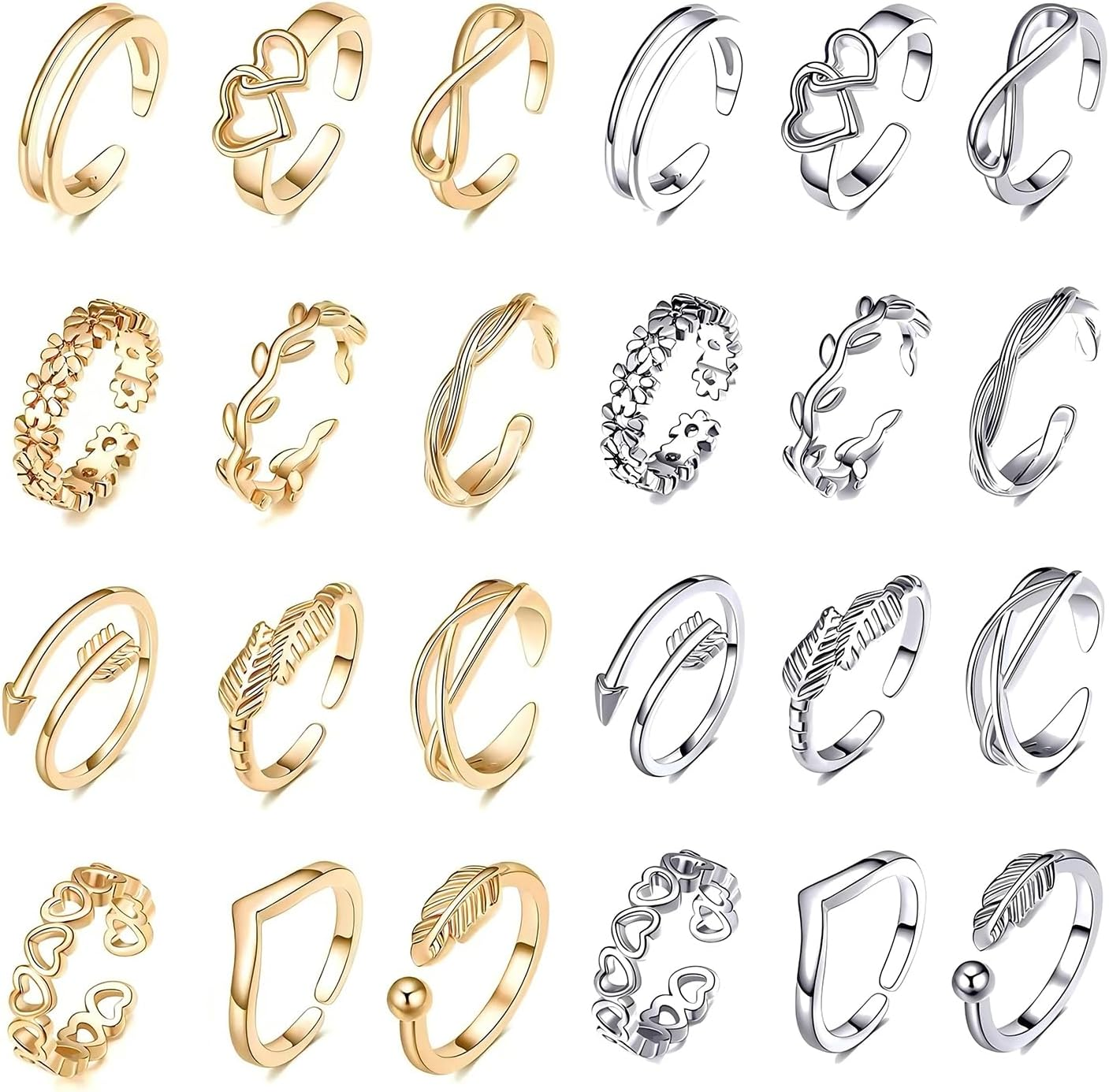 24Pcs Adjustable Toe Rings, Gold Silver Minimalist Open Toe Rings Set for Women
