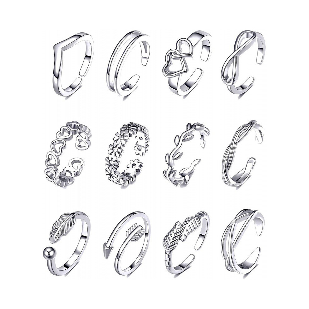 (Silver 12-piece set, Opening is adjustable) 12PCS Adjustable Toe Rings for Women 14K Gold Plated Open African Toe Rings Summer Beach Foot Jewelry Set