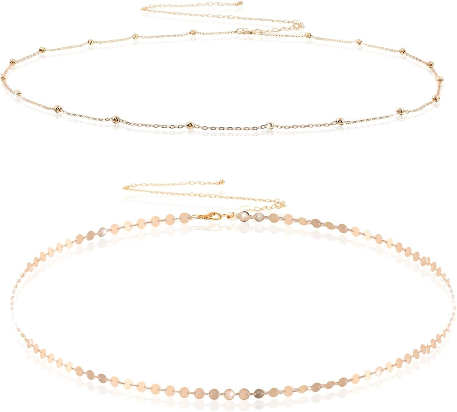 TINGN 2PCS Gold Waist Chains for Women - Gold Plated Waist Chain Sequin Belly Body Chain Layered Gold Snake Chain Minimalist Body Jewelry for Women Adjustable Waist Chain for Summer Beach Bikini