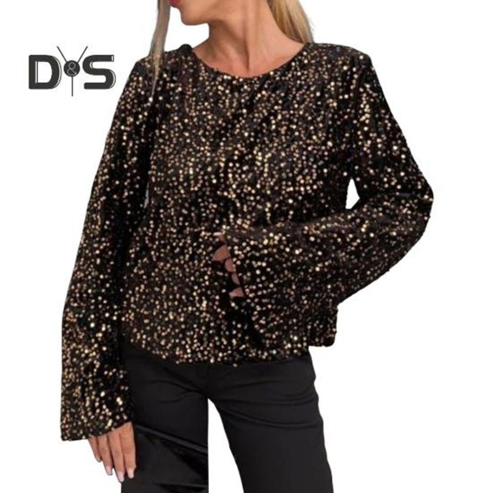 (L, golden) Women Tops Crew Neck Long Sleeve Back Tie Sexy Tops Loose Fit Solid Color Casual Blouse Party Daily Wear