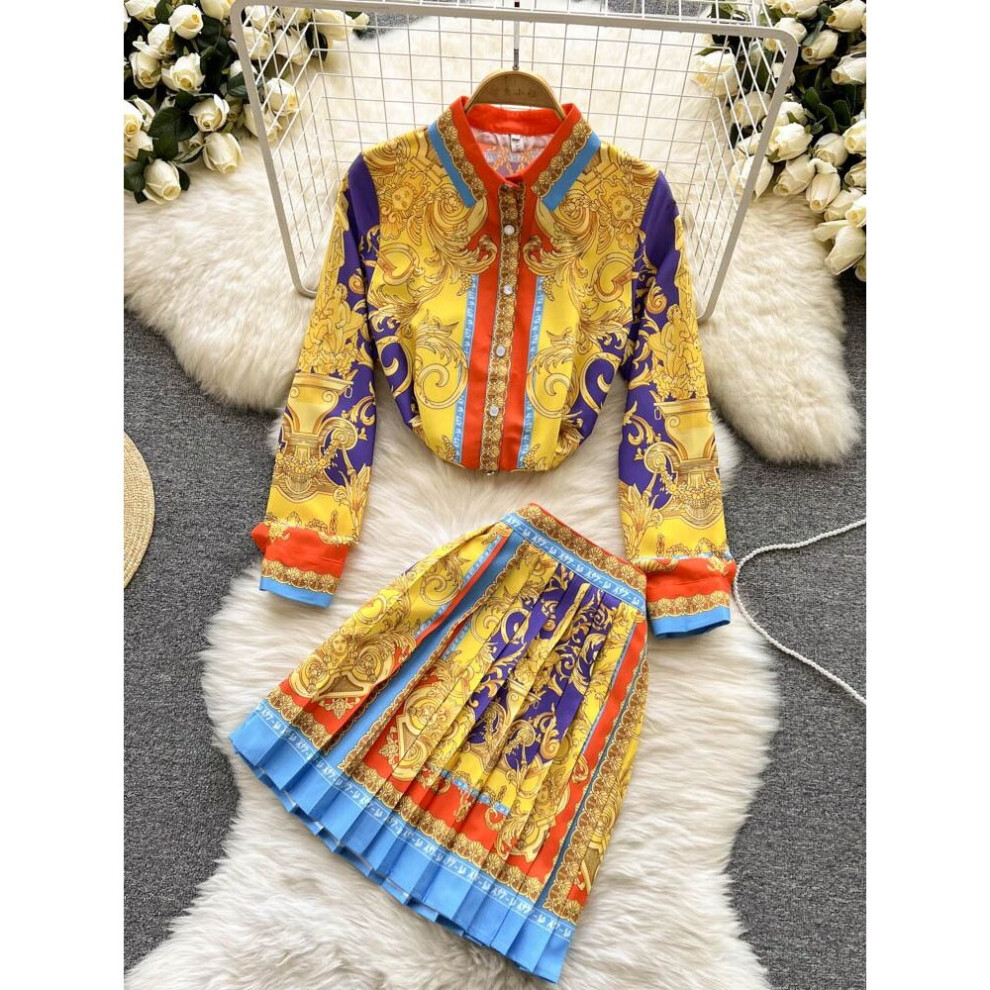 Golden Flower Print Two Piece Set Women Temperament Long-Sleeved Shirt Blouse + High Waist Pleated Mini Skirt Suit