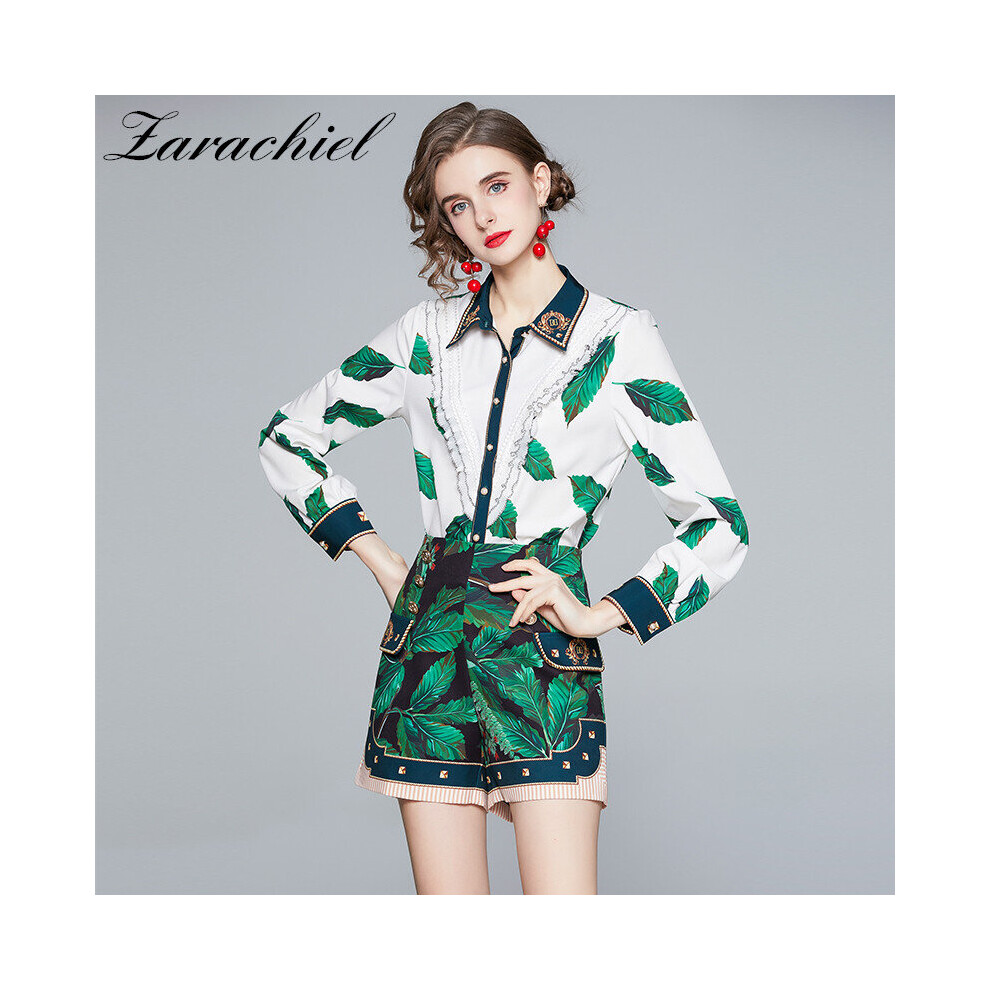 Summer Women's Two Piece Set Green Leaves Printed Long Sleeve Ruffles Shirt Blouse + Golden Button Shorts Suit