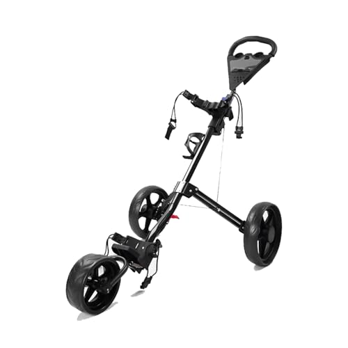 UPALDHOU 3 Wheel Folding Push Cart Golf Caddy Foldable Pushcart with Foot Brake Adjustable Buckle for Golf Bag Tee Holder Cup Storage