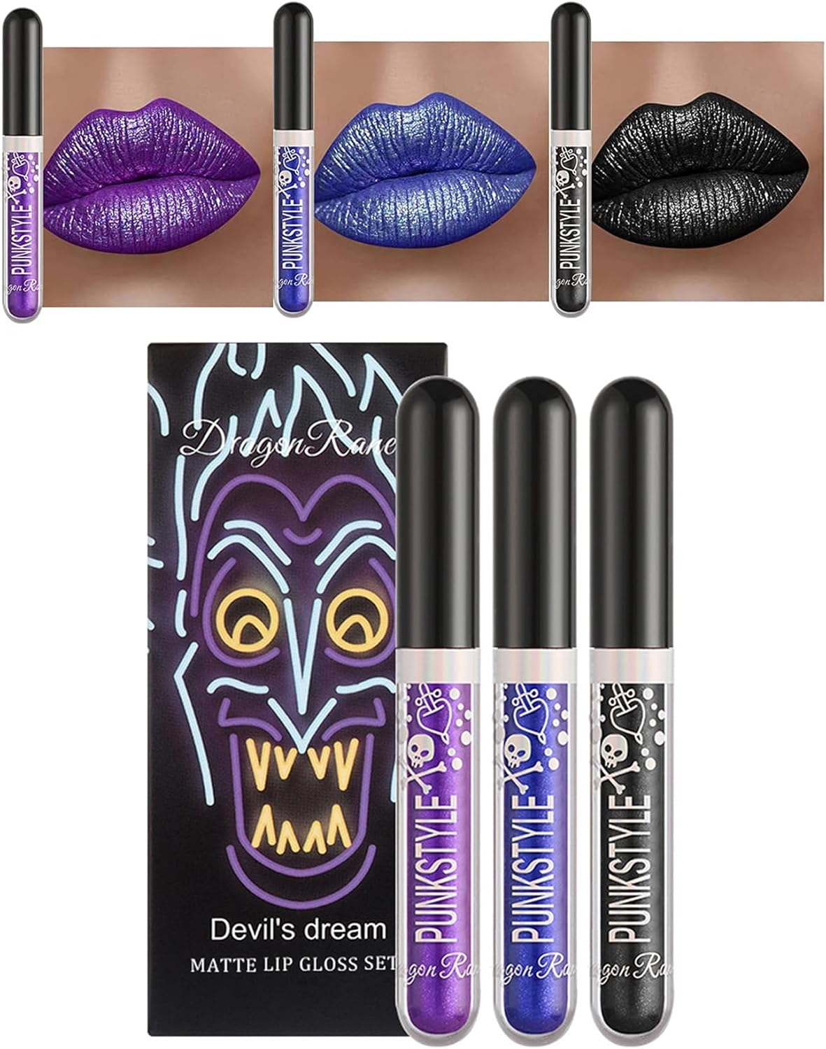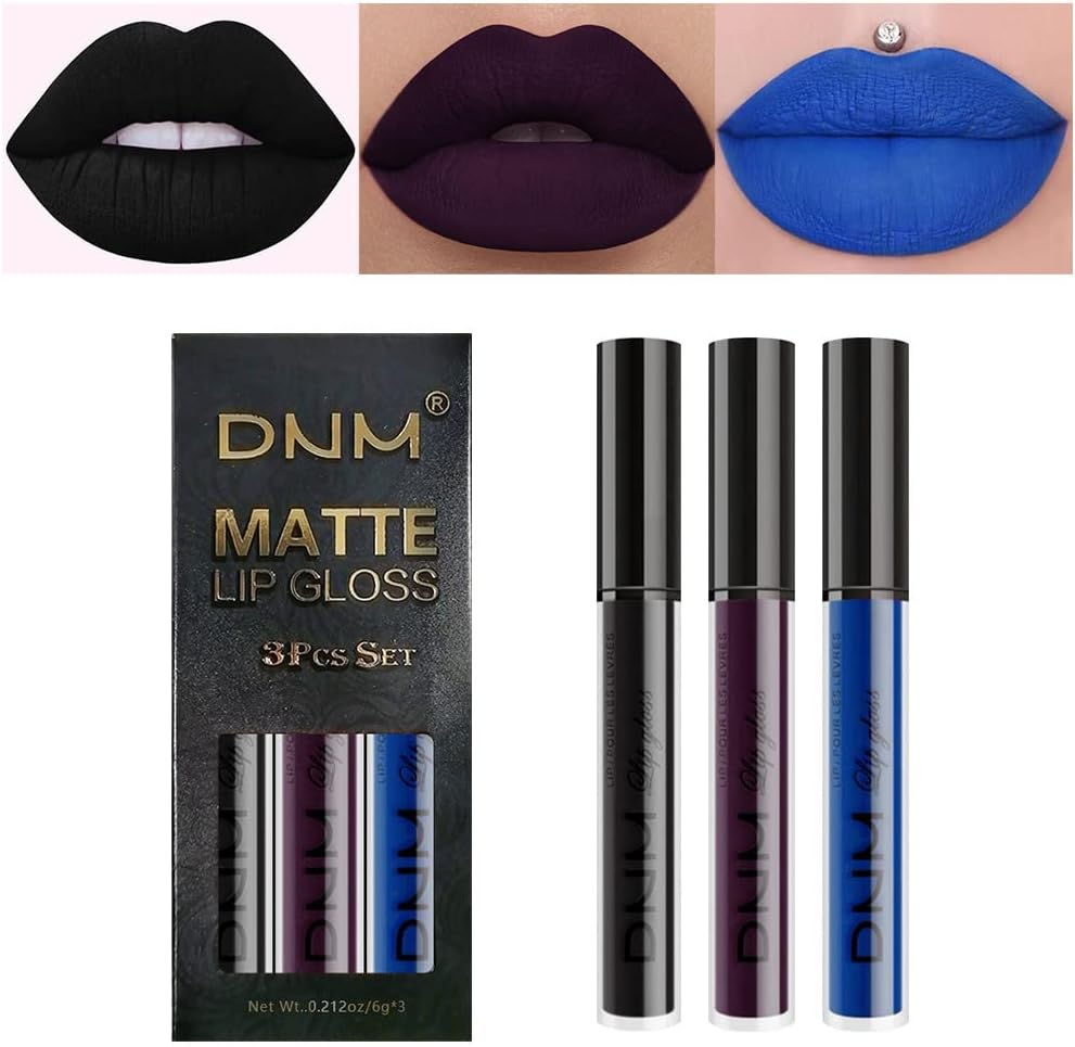 Lip Gloss Set, 3Pcs Noble Purple Dark Blue Black Matte Liquid Lipstick Set, Long