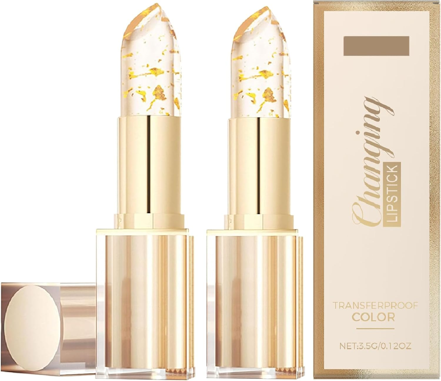 2Pcs Colour Changing Lipstick, PH Adjusting Clear Lip Stick with Gold Foil, Tran