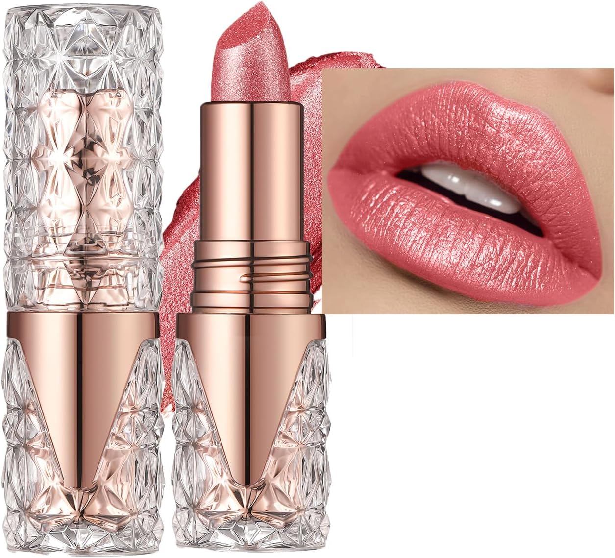 Glitter Lip Gloss Lipstick, Diamond Metallic Pink Coral Shimmer Lipgloss Liquid