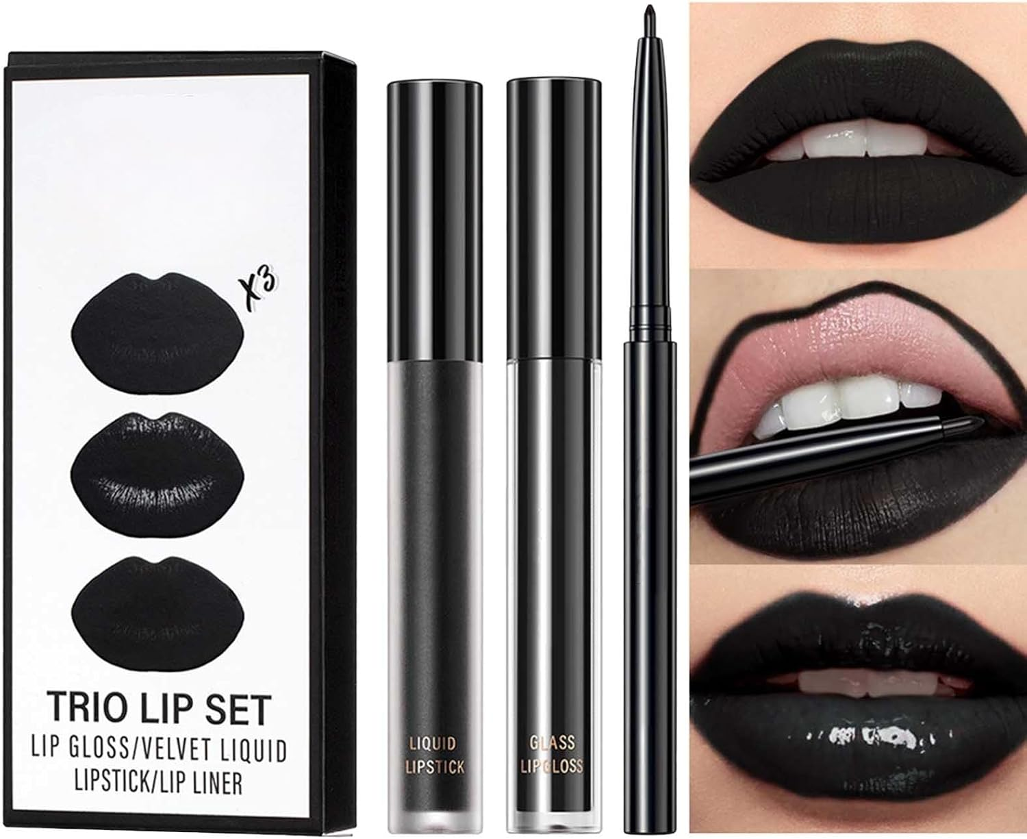 3-In-1 Black Matte Lip Liner and Lipstick Set - Non-Sticky, Long Lasting, Waterp