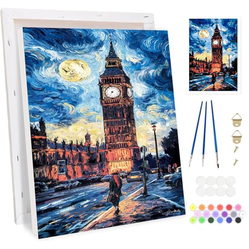 Bowetile Big Ben Framed Paint by Numbers for Adults, Halloween Landscape Painting by Numbers Kit for Adults Beginners Canvas Kit, DIY Color Oil Painting Acrylic Paints for Home Wall Decor 20x30cm