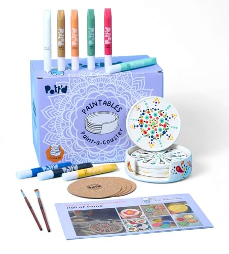Pott’d Paintables Paint-a-Coaster Kit, DIY Pottery Painting Kit for Adults with Coasters, Holder, Dotting Paints, Brushes and Guide, Craft Kit for Beginners, Ideal for Home Decor or Handmade Gifts