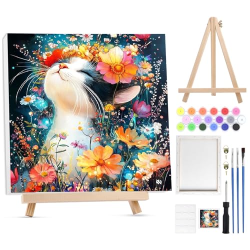 BOWETILE Flowers Cat Paint by Numbers for Adults with Framed Canvas&Wooden Easel,Landscape Painting by Numbers Kit for Adults Beginners Canvas Kit, DIY Color Acrylic Paints for Home Wall Decor 30x30cm