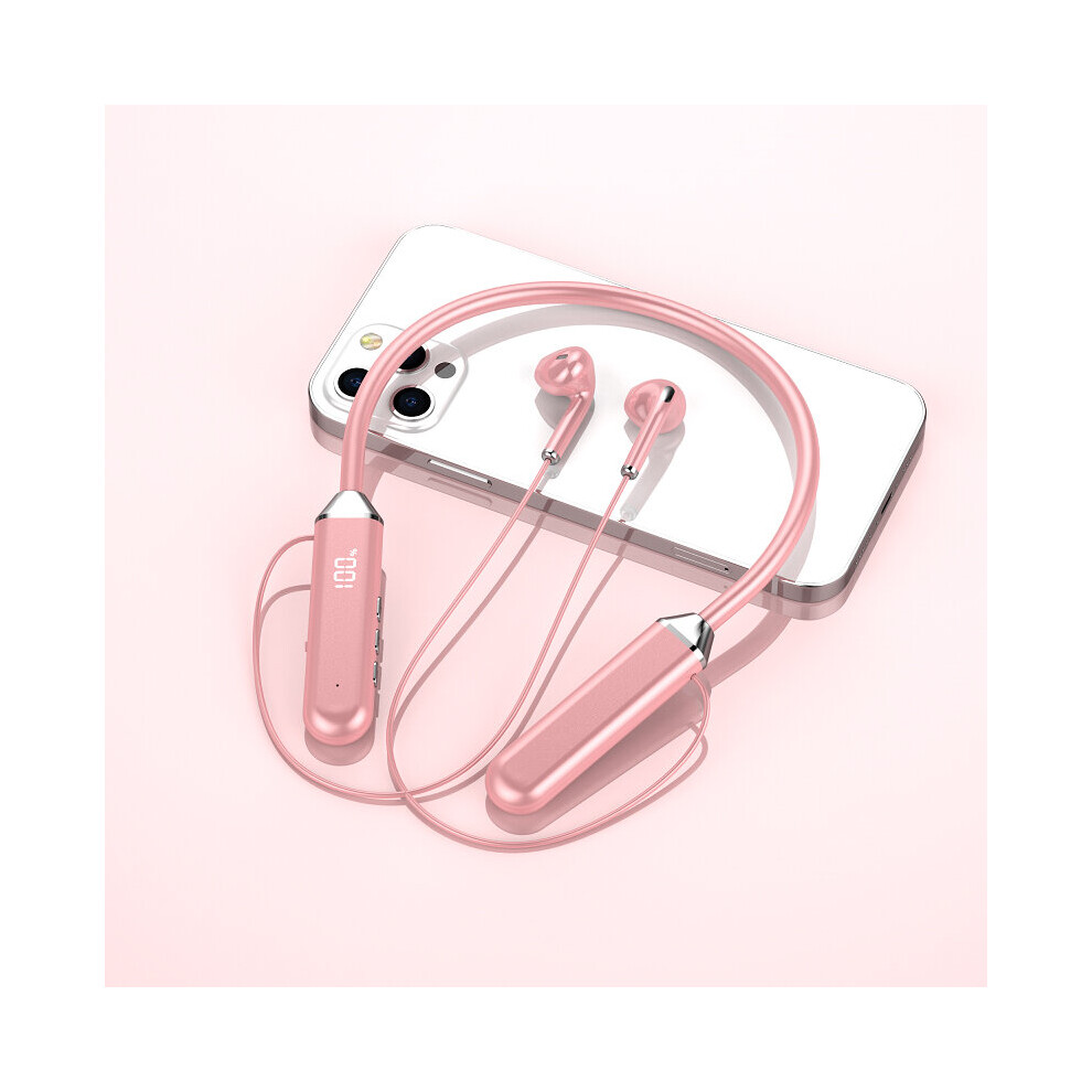 (a-Pink) Bluetooth 5.2 Neckband Wireless Earphone with LED Degital Magnetic Sports Running Headset Waterproof Earbuds with Mic In-Ear