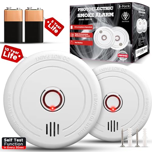 Fire Alarms Battery Operated for Home,Smoke Alarms Detector with 10 Years Life/5 Years Battery, Fire Alarm with LED Indicator and Silence Button Photoelectric Smoke Alarms for Home (2 Pack)