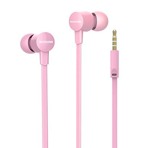 MOXKING Wired Tangle Free Earphones With for kids women small ears, Comfortable and Lightweight Flat Cable Ear bud with Microphone and Volume Control for Cell Phone Laptop (Pink)