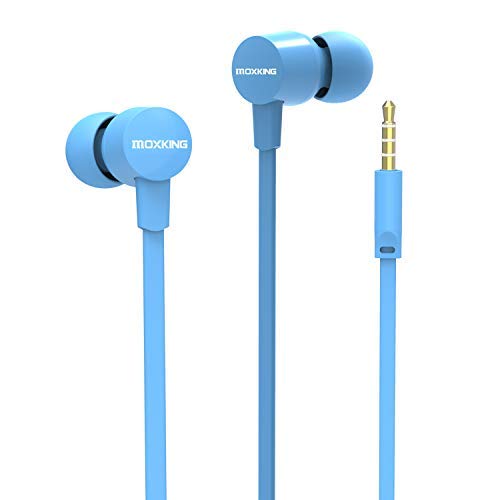 MOXKING Wired Tangle Free Earphones With for kids women small ears, Comfortable and Lightweight Flat Cable Ear bud with Microphone and Volume Control for Cell Phone Laptop (Blue)