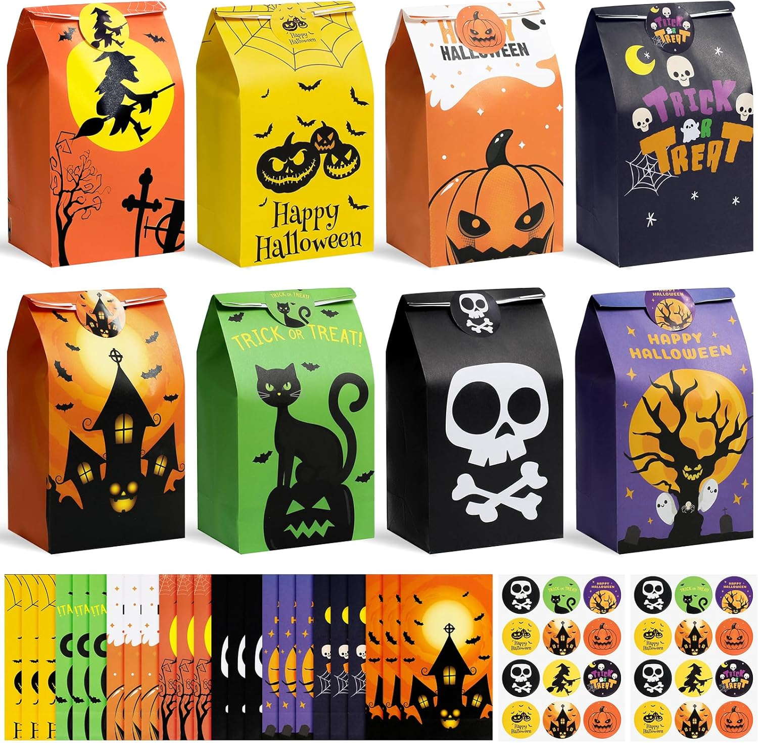 Halloween Treats Bags Party Favors - 50 Pcs Kids Halloween Candy Bags for Trick or Treating + 60 Pcs Halloween Stickers, Mini Paper Gift Bags for Treats Snacks, Halloween Goodie Bags Party Supplies