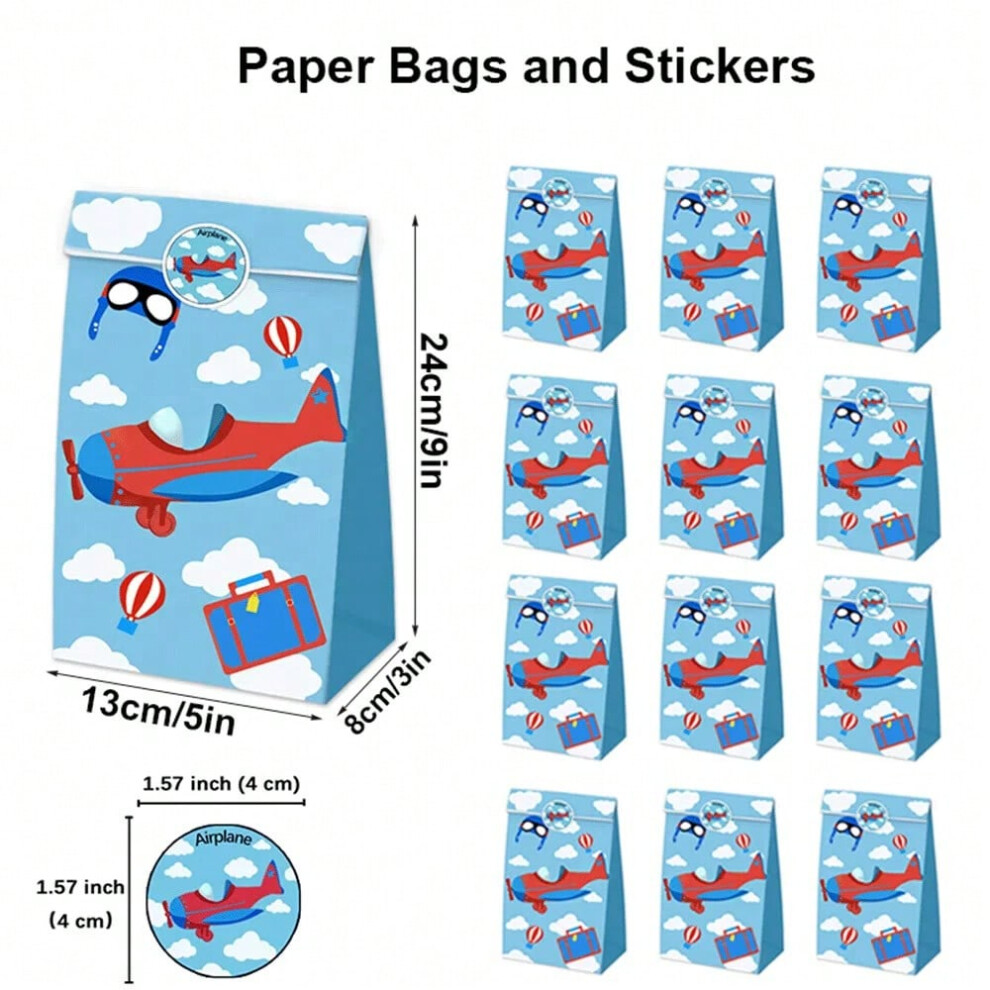 (12pcs-1, 24x13x8cm) 12pc Cartoon Airplane Goodie Bags Kraft Paper Candy Bag with Stickers Aviator Adventure Theme Birthday Party Supplies Kids Gift