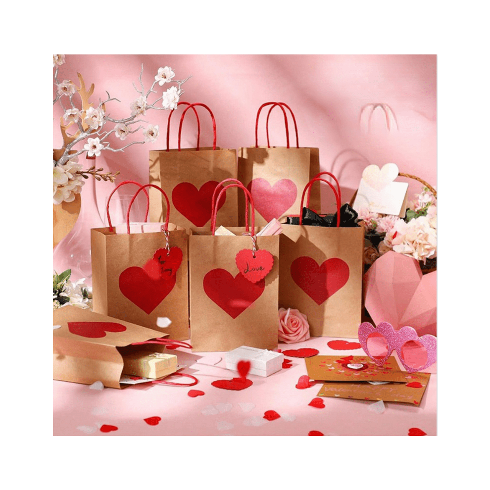 PokFhgur M 24 Pcs Valentines Day Goodie Bags with Handles Heart Love Paper Bags for Wedding and Valentine