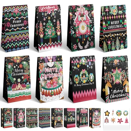 Gcardist 32Pcs Christmas Treat Paper Bags Black Gift Bag Mini Party Candy Goodie Snack Bags for Xmas Party, Birthday Classroom (32 Stickers 12cm×8cm×24cm)