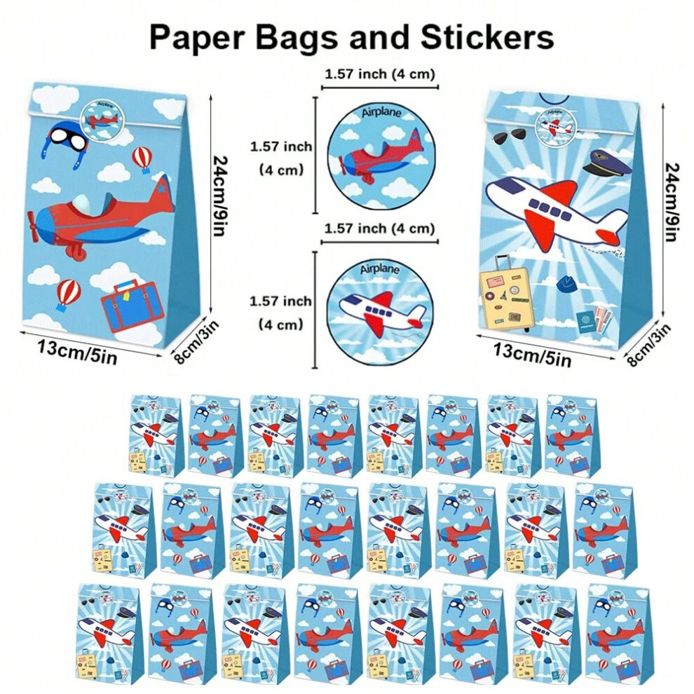 (24pcs, 24x13x8cm) 12pc Cartoon Airplane Goodie Bags Kraft Paper Candy Bag with Stickers Aviator Adventure Theme Birthday Party Supplies Kids Gift