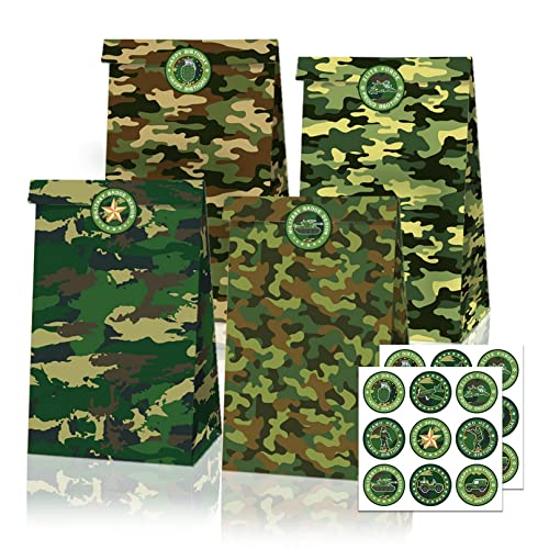 12 Pack Camouflage Gift Bags, Camo Party Supplies, Green Paper Treat Bags for Kids, Goodie Bag for Birthday, Camouflage Theme