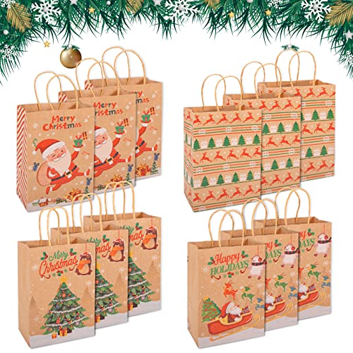 Christmas Kraft Paper Bags, SMALUCK 12 Pieces Xmas SMALL Assorted Paper Goodie Bags Bulk with handle for Christmas Party Favor Supplies 145x210x80 mm (Brown)
