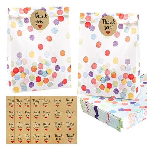 GTNCE 50PCS Rainbow Dot Paper Party Bags - Small Kraft Gift Bags with 50 Thank You Stickers for Kids Birthday, Goodie Treat Bags, Party Favor Bags for Baby Shower, Wedding, Christmas, Halloween
