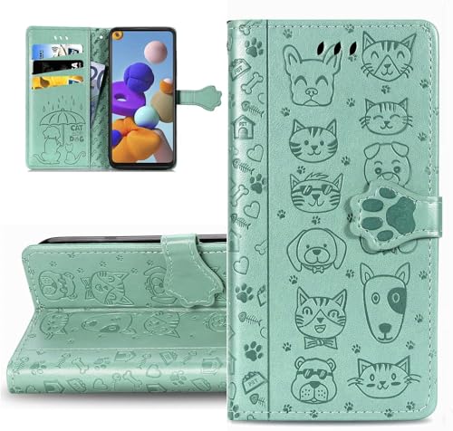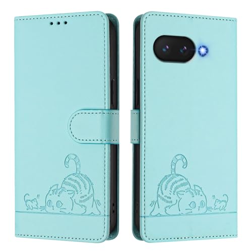 ScandiCasis Compatible with Google Pixel 9A Flip Case, Cat Pattern Leather Cover with [Card Slots] [RFID] [Wallet] [Kickstand] Shockproof Case, Mint Green