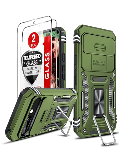 LeYi for Google Pixel 9a Phone Case, with Camera Lens Cover Slider, 2 Pack Screen Protectors, Ring Stand Holder Military Grade Protective Shockproof Armour Cover for Google Pixel 9 a, Green