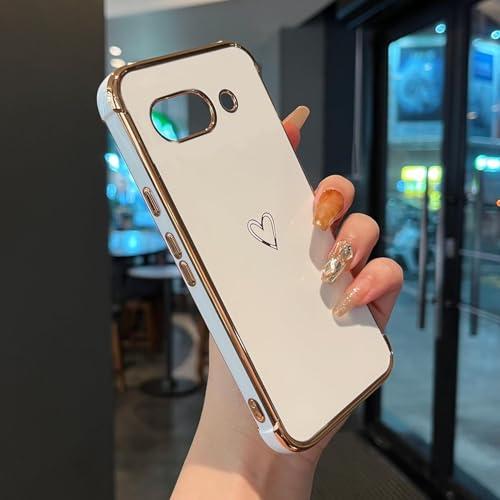 Knoowcase for Google Pixel 9A Case for Google Pixel 9A Phone Case for Girls Women Shockproof Flexible Silicone Bumper Lens Protection Luxury Plated Gold Heart Slim Anti Scratch Phone Cover,White
