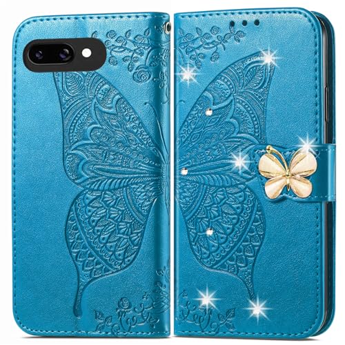 Reevermap for Google 9A Case Glitter Crystal Flip PU Leather Phone Cover for Google Pixel 9A, Shockproof Wallet Card Slots Butterfly Gems Bling Shiny Magnetic Clasp Kickstand, Blue