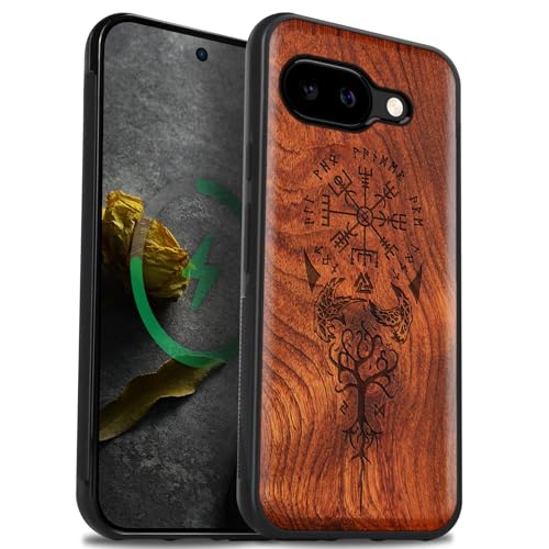 Carveit Magnetic Wooden Case for Google Pixel 9a Case, Wood Artisan Engraved & Soft TPU Shockproof Cover, Compatible with MagSafe Wireless Chargers (The Guiding Vegvisir) Rosy