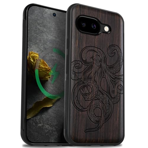 Carveit Magnetic Wooden Case for Google Pixel 9a Case, Wood Artisan Engraved & Soft TPU Shockproof Cover, Compatible with MagSafe Wireless Chargers (Octopus Drawing) Blackwood