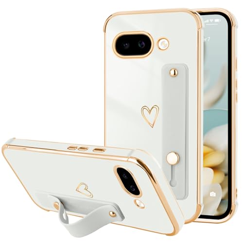 LLZ.COQUE for Google Pixel 9a Case for Women Girls, Luxury Plated Bumper with Cute Heart Design Cover, Adjustable Hand Strap Stand Protection Phone Case for Google Pixel 9a, White