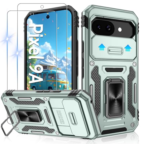 Jshru for Google Pixel 9A Case with 2 Pack Screen Protector, Military Grade Shockproof, Slide Camera Cover, Ring Stand Phone Case for Google Pixel 9A, Alpine Green