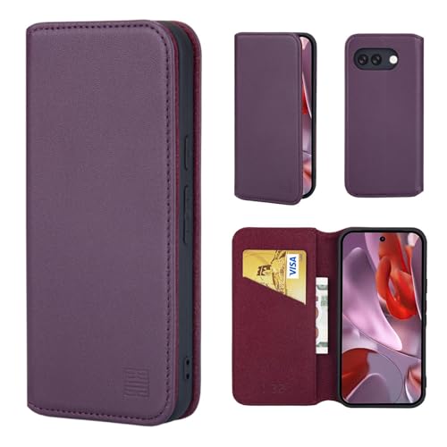 32nd Classic Series 2.0 - Real Leather Book Wallet Flip Case Cover For Google Pixel 9a, With RFID Blocking Card Slot, Magnetic Closure and Built In Stand - Aubergine