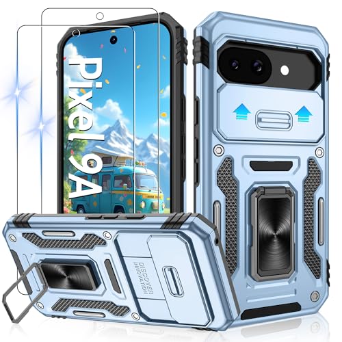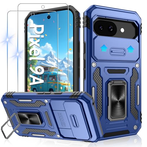 Jshru for Google Pixel 9a Case with 2 Pack Screen Protector,Military Grade Shockproof Pixel 9a Cover with Slide Camera Cover,Ring Stand Phone Case for Google Pixel 9a,Blue